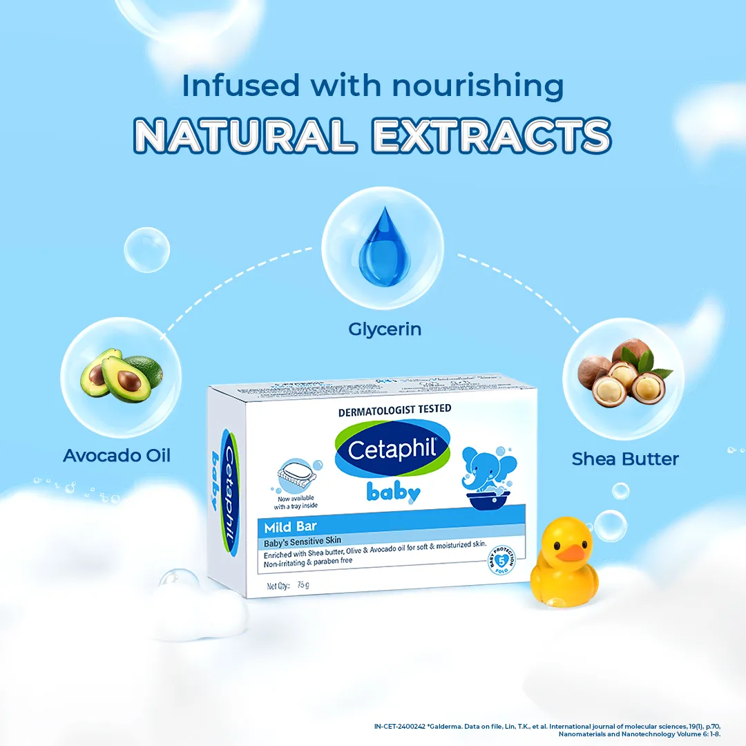 Paraben-Free Cetaphil Baby Mild Bar has a soap-free formulation which gently cleanses your baby’s skin without causing any irritation. It is enriched with shea butter, avocado oil and olive oil which moisturises your baby’s delicate skin. It helps maintain the skin’s pH balance while making it soft and supple. It is made with natural ingredients and is free of parabens and SLS.