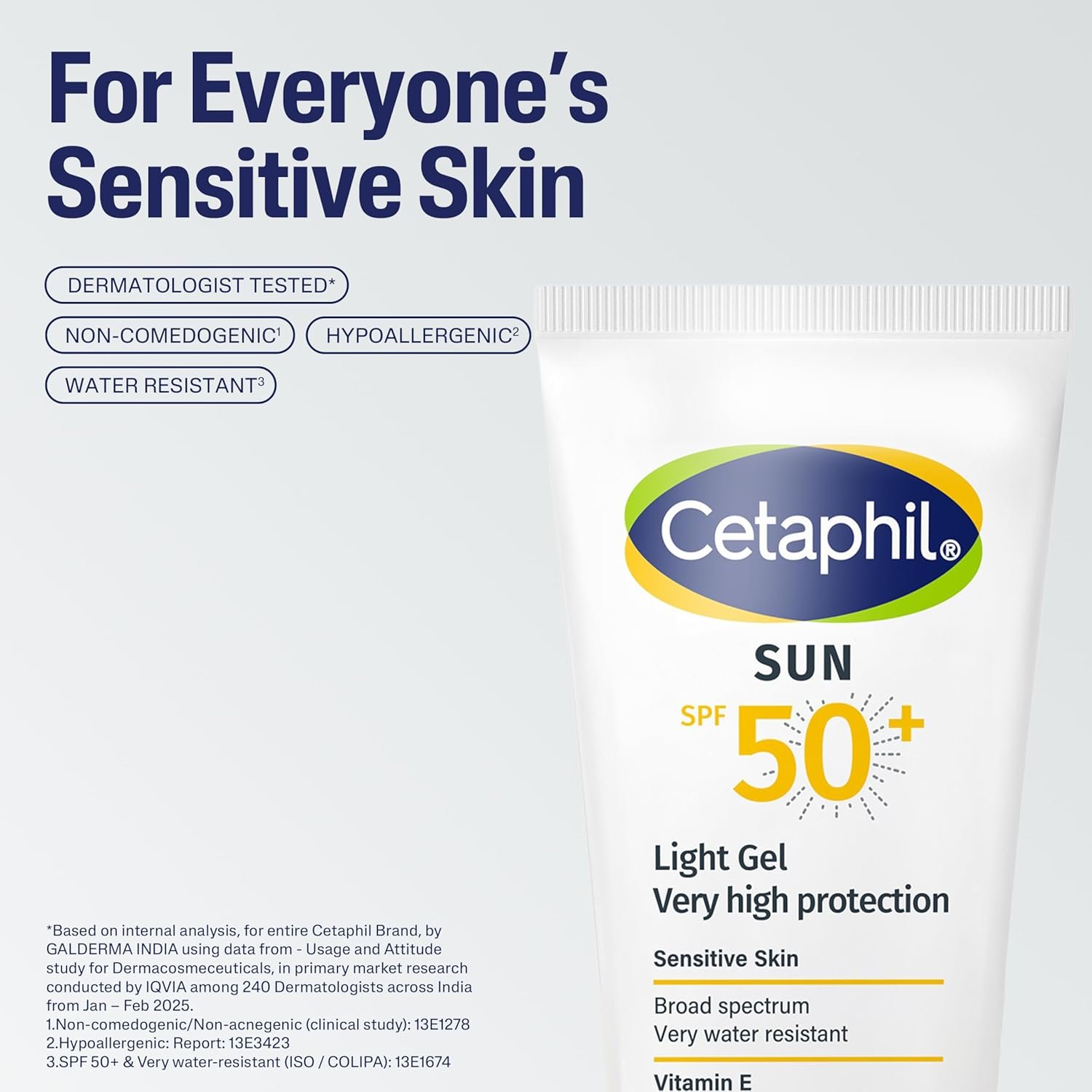 Cetaphil SUN SPF 50 Light gel is formulated for sensitive/oily skin and is suitable for the face and body. Photostable UV filters offer highly effective UVA and UVB protection.