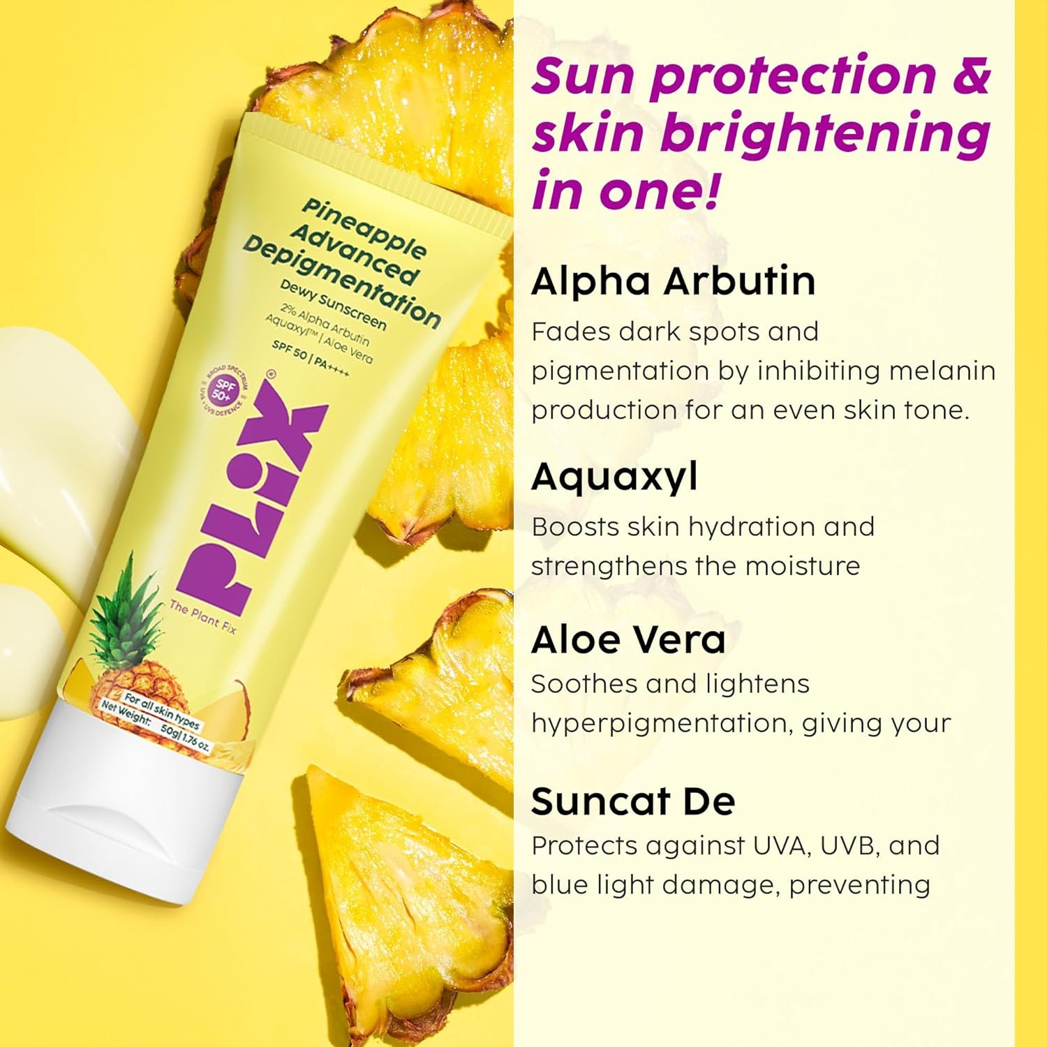 The Pineapple Advanced Depigmentation Dewy Sunscreen SPF 50 PA++++ is your go-to solution for sun protection and skin brightening. This advanced sunscreen blends potent ingredients like 2% Alpha Arbutin, Aquaxyl, Aloe Vera, and Suncat De to not only protect your skin from harmful UVA, UVB, and blue light rays but also target hyperpigmentation and improve skin tone.